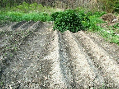 Potatoes grow best in soft soil (soil that has no rocks or other obstacles to get in its way) and in a kind of hilled long mound. When you plant them you want to dig a long trench about 8-10” down, and place each potato roughly 8” apart (depending on the variety). Then you use two circular discs to create a hill or mound all along the trench which adds another 4-6” to the growing depth. This gives the potato much more room to grow (it won’t punch down into the earth like a carrot or parsnip) and it decreases the weeds (because of the hill) and makes it easier to pull them as they mostly end up in between the mounds.